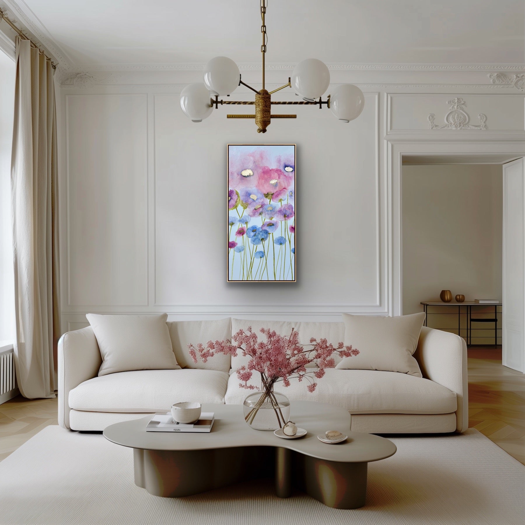 Ink on canvas. 24 x 48 Framed in a walnut wood float frame.